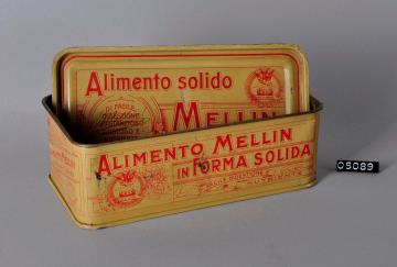 Zweifarbig bedruckte, gefalzte Blechschachtel mit flachem Einlegedeckel mit Zarge. Alle vier Seiten mit brauner Grundfarbe und roter Schrift bedruckt. innen lackiert. Wurde für Kinderkekse der Firma Mellin verwendet.