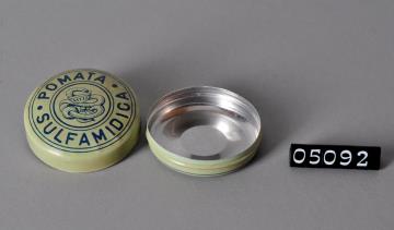 Zweifarbig bedruckte, runde Dose aus Weißblech für Sulfonamid-Salbe. Nach oben gewölbter und bedruckter Stülpdeckel . Unterseite mit breitem Standring und eingewölbtem Boden. Grundfarbe außen grau-grün. Salbenname und Aeskulapschlange mit Kelch blau aufgedruckt. Salbe, meist auf Vaselinbasis, wurde warm eingegossen.