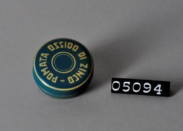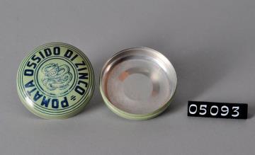 Zweifarbig bedruckte, runde Dose aus Weißblech für Zink-Salbe. Nach oben gewölbter und bedruckter Stülpdeckel . Unterseite mit breitem Standring und eingewölbtem Boden. Grundfarbe außen grau-grün. Salbenname und Aeskulapschlange mit Kelch blau aufgedruckt. Salbe, meist auf Vaselinbasis, wurde warm eingegossen.