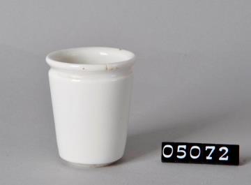 Zylindrische, innen und außen weiß glasierte Salbenkruke (Salbendose) aus Steingut mit Binderand. Leicht aufgewölbter glasierter Boden mit Standring. Alle zwölf Kruken mit, an der Oberkante geriffeltem, Metallstülpdeckel. Alle ohne Bodenprägung.