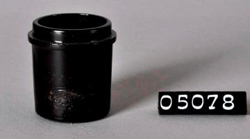 Zylindrische Salbenkruke (Salbendose) aus braunem Glas mit Stülpdeckelrand. Eingewölbter Boden mit Standring und Bodenprägung (20). Mündungsrand geschliffen. Prägung am unteren Rand zwischen Boden und Ring: VIG in einem Bogen. Alle acht Kruken mit farbigem Stülpdeckel aus Celluloid, davon drei mit blauem, zwei mit lindgrünem, zwei mit gelbem und eine mit rotem Deckel.