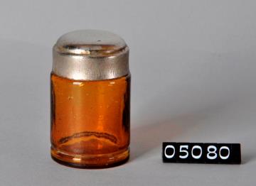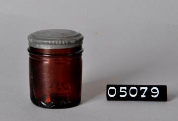 Zylindrische Salbenkruke (Salbendose) aus braunem Glas mit vielen Lufteinschlüssen, Stülpdeckelrand und Rille am unteren Wandrand. Eingewölbter Boden mit Standring und Bodenprägung (20). Alle zehn Kruken mit silbrigem, festsitzendem Blechstülpdeckel. Verschiedene Hersteller. Eines davon ohne Deckel und ohne Rille am unteren Wandrand.