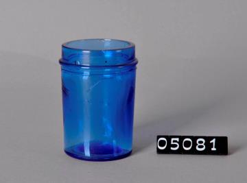 Leicht konische Salbenkruke (Salbendose) aus blauem Glas mit vielen Schlieren. Stülpdeckelrand und Seitennaht. Eingewölbter Boden mit Standring und Bodenprägung (20). Alle 17 Kruken ohne Stülpdeckel. Verschiedene Farbigkeit.