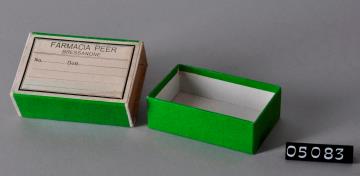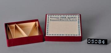 Rechteckige Schiebeschachtel, außen mit grünem Glanzpapier bezogen. Innen weißer Glanzkarton. Auf der Oberseite weiße, schwarz umrandete Etikette Firmenname. Oberschachtel mit weißem Rand. Verschreibungsnummer und verschreibendenr Arzt. Linien für die Inhaltsangabe und Einnahmevorschrift. Wurde für die Abgabe der Pulverbriefchen verwendet.