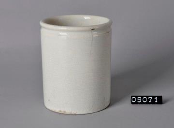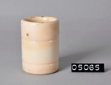 Zylinderförmige, elfenbeinfarbige Salbenkruke (Salbendose) aus Irdengut mit Binderand und nach innen gewölbtem Boden. Außen und innen glasiert. Boden unglasiert jedoch mit Glasurresten. Haarrisse am oberen Rand. Heller Scherben. Mit Bodenprägung: 11