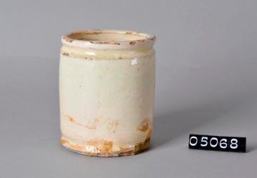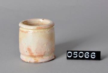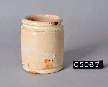 Zylinderförmige, beige Salbenkruke (Salbendose) aus Irdengut mit Binderand und Bodenplatte. Außen und innen grobe Glasur. Boden unglasiert.