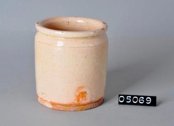 Zylinderförmige, beige Salbenkruke (Salbendose) aus Irdengut mit Binderand und Bodenplatte. Außen und innen glasiert. Rotbraune Flecken. Außen rauh. Boden unglasiert jedoch mit Glasurresten. Roter Scherben. Am Mündungsrand an mehreren Stellen Glasur abgplatzt.