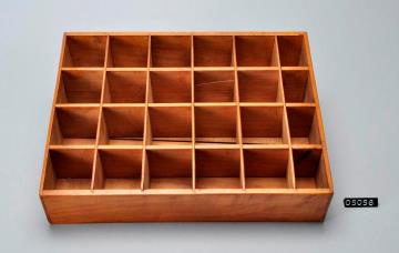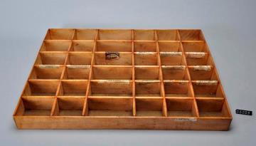 Setzkasten aus Holz für Etiketten mit 36 Fächern, davon mittig sechs breitere Fächer mit 100 x 53 mm. Restliche Fächer 60 x 50 mm. Bretter ca 5 mm dick. Passte in die Schubladen der 1912 angekauften Einrichtung. Eckverbindung des Rahmens mittels halbverdeckter Schwalbenschwanzzinkung. Oberkante der Fächer rund geschliffen. Boden mit Rahmen und den Seitenteilen der Fächer genagelt. Teilweise Etikettenreste an der Oberkante der einzelnen Fächer.