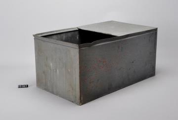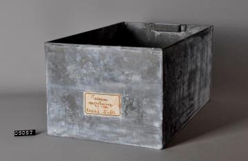 Fast quadratischer, grauer Einsatz aus festerem Blech, Oberkante gerundet, Ecken gelötet. Mittig angelöteter runder Haltegriff aus Eisen. Ohne Deckel. Dieser Einsatz diente für die Aufbewahrung und Transport der Spateln. Höchstwahrscheinlich mit der Einrichtung aus dem Jahre 1912 angekauft.