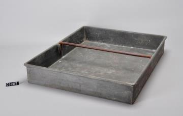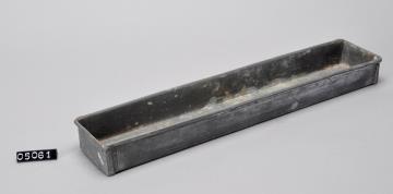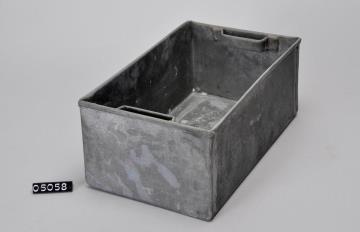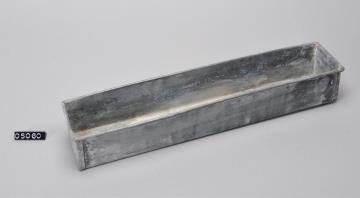 Rechteckiger, grauer Einsatz aus festerem Blech, Oberkante gefalzt, Seitenteile angelötet. Ohne Deckel. Innen an der kurzen Seite zwei angelötete Handgriffe. Mittig eingelöteteter Abteiler. Dieser Einsatz diente für eine Schublade der Einrichtung aus dem Jahre 1912. Die Blecheinsätze wurden für fettige, stark riechende und pulvrige Substanzen verwendet.