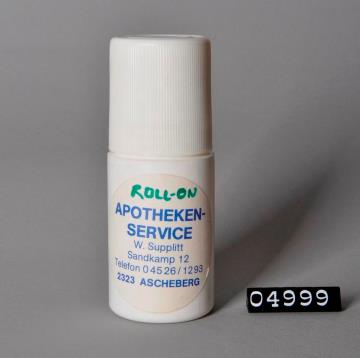 Musterpackung ohne Inhalt: Zylinderförmige, weiße Kunststoffflasche mit längsgeriffeltem Schraubverschluss; komplett mit Kugel. Seitennaht. Bodenprägung: FEMIT und Produktnummer.
