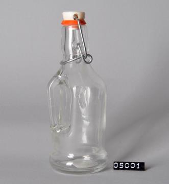 Farblose, leicht konisches Flasche, flache Schulter, langer Hals mit Drahtbügelverschluss aus Metall und Kunststoff. Schulterständiger Henkel und hier eingedellte Wand. Fußzone nach außen gewölbt, Boden leicht nach innen gewölbt, Standring geriffelt