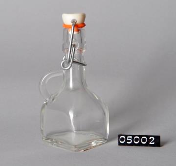 Farblose, am Boden rechteckige Flasche mit Drahtbügelverschluss aus Metall und Kunststoff. Hohe Schulter übergehend in langem, runden Hals. Schulterständiger, aufgesetzter Henkel.