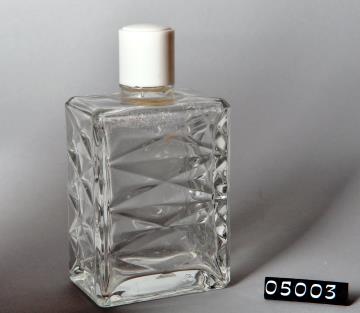 Farblose, rechteckige Kosmetikflasche, flache Schulter. Kurzer Hals mit Gewinde; enge Mündung mit weißer Bakelitkapsel. Alle Wände mit rautenförmigem, formgeblasenem Dekor. An der Vorderseite teilweise glatte Fläche fürs Etikett. Boden gewölbt mit Standring und kleeblattähnlicher Prägung.