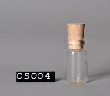Zylinderförmiges, kleines Weithalsfläschchen mit Korkstopfen. Flache Schulter, kurzer Hals. Mündungsrand verdickt.