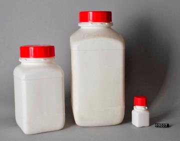 Rechteckiges Weithalsgefäß aus weißem Kunststoff (HDPE) mit seitlicher Naht, Wand leicht eingekerbt für Etikette. Roter, seitlich geriffelter, Schraubdeckel. Aufgebrochener Sicherheitsverschluß. Diente als Verpackung der Produkte der Firma Caelo. 2500ml, 1500ml und 50ml Gefäß