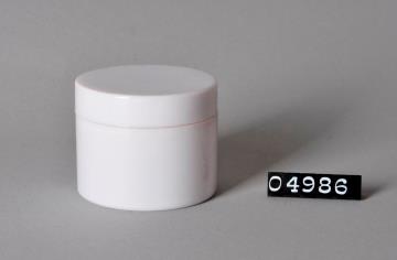 Mustersalbendose weiß, doppelwandig aus Moplen (PP-H). Aufgeschraubter Deckel mit Dichteinlage. Boden mit Standring. Hergestellt von der Firma S.I.P in Opera (MI).