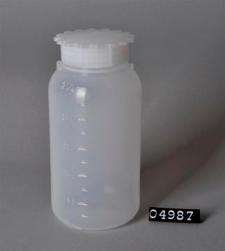 Runde Weithalsflasche, milchig weiß, aus LDPE mit Schraubverschluss und Dichteinsatz. Seitennaht. Schraubverschluss geriffelt mit vier Löchern. Am Hals zwei Ösen, welche das Versiegeln des Schraubverschlusses mittels einer Schnur ermöglichen. An der Wand Messmarkierungen bis 250ml in 25ml -Abständen. Boden nach innen gewölbt mit Recycling-Code für LDPE (= 04), EU-Symbol für Lebensmittelbedarfsgegenstand und Abfallzeichen (Abfallmännchen) als Aufforderung zur umweltgerechten Entsorgung.