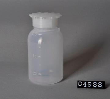 Runde Weithalsflasche, milchig weiß, aus HDPE mit Schraubverschluss und Dichteinsatz. Seitennaht. Schraubverschluss geriffelt mit vier Löchern. Am Hals zwei Ösen, welche das Versiegeln des Schraubverschlusses mittels einer Schnur ermöglichen. An der Wand Messmarkierungen bis 100ml in 20ml -Abständen. Boden nach innen gewölbt mit (höchstwahrscheinlich falschem) Recycling-Code für HDPE, EU-Symbol für Lebensmittelbedarfsgegenstand und Abfallzeichen (Abfallmännchen) als Aufforderung zur umweltgerechten Entsorgung.