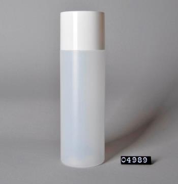 Musterpackung ohne Inhalt: Zylinderförmige Kunststoffflasche aus PE mit Kippverschluss; milchigweiß. Abgeflache Schulter und Seitennaht. Kippverschluss aus silbrig überzogenem Kunsstoff. Bodenprägung "PE" und Recyclingsymbol.