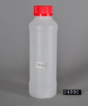 Zylinderförmige Flasche, milchig weiß, aus PE-HD der Firma Hofmann Plastik. Seitennaht. Roter Sicherheitstsschraubverschluß. Boden leicht nach innen gewölbt mit aufgeprägtem Code für PE-HD, Recyclingsymbol und Firmenname. Einkaufspreis € 0,51.