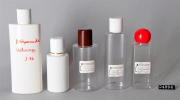 Musterpackungen der Firma Vetrocap aus I-20090 - Trezzano sul Naviglio (MI), ohne Inhalt: fünf verschiedene Behälter aus Kunststoff für flüssige oder viskose Medien, aus PVC (weiß, 04994, 04994-2) und PET(farblos).