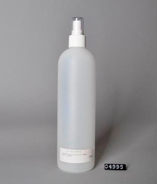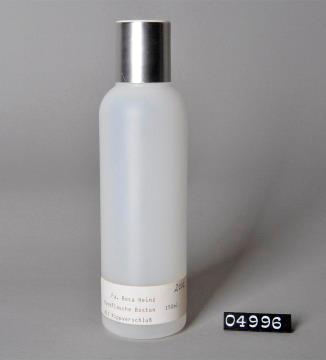 Musterpackung ohne Inhalt: Zylinderförmige Kunststoffflasche aus PE mit Zerstäuber; milchigweiß. Abgeflache Schulter und Seitennaht. Zerstäuberpumpe weiß/gerillt bestehend aus Schraubkörper mit Pumpe, Steigrohr und transparenter Schutzkappe. Bodenprägung "H" und "PE".