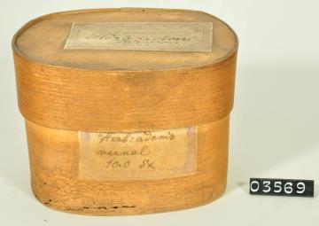 Hellbraune, im Grundriss rechteckige Spanschachtel mit abgerundeten Ecken und Stülpdeckel. Signatur auf dem Deckel und seitlich an der Wand. Darinnen geschnittenes Kraut des Frühlings-Adonisröschen.