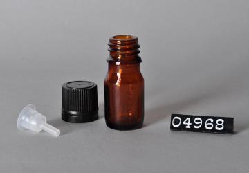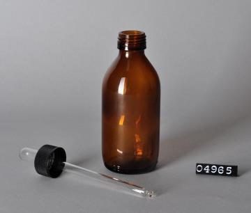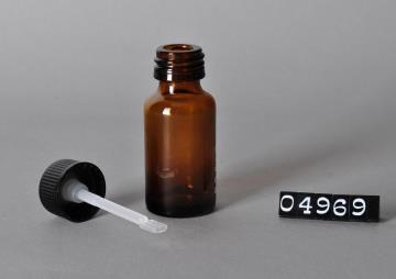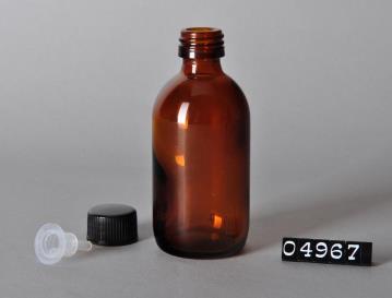 Brauner, runder zylindrischer Flaschenkörper mit abfallender Schulter und Seitennaht. Mündungsrand verstärkt, mit Schraubgewinde. Schwarzer Drehverschluss aus Polypropylen (PP) mit Tropfenzähler aus farlosem Glas und Kunsstoffkappe aus Polyvinylchlorid (PVC). Bodenrand geriffelt. 10, 20, 100, 125ml.