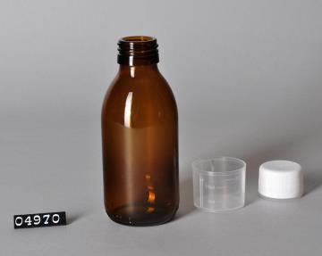 Brauner, zylindrischer Flaschenkörper mit abfallender Schulter und Seitennaht. Mündung verstärkt und Schraubgewinde. Sicherheitsverschluss mit Dichtung aus PE-LD (LDPE). Fünf Flaschen mit schwarzem Schraubverschluss zu 1000, 500, 300, 250, 200ml . Drei Flaschen mit weißem Schraubverschluss und Dosierbecher zu 150, 100 und 50ml. Volumenangabe und Punkte, welche auf das Herstellungsdatum verweisen, seitlich aufgeprägt. Bodenrand geriffelt.