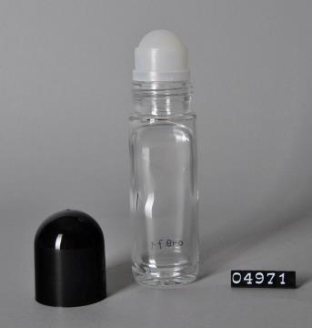 Zylindrischer, beidseitig abgeflachter, farbloser Flaschenkörper. Mündung mit Gewinde und kugelförmigem Kunststoffeinsatz (Roll-On). Schwarzer Schraubverschluss aus Kunststoff. Leicht nach innen gewölbter Boden mit geriffeltem Standring und Bodenprägung.