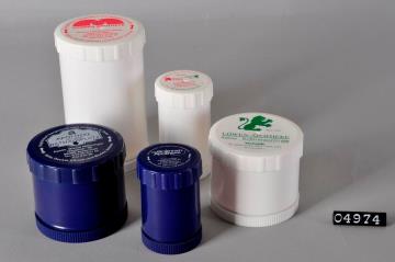 Fünf TOPITEC® Kruken (aponorm® Drehdosierkruken). Apotheken- und patientengerechte Drehdosierkruke. Krukenkörper mit aufgeschraubtem Deckel aus PP, blau, Hubboden aus PE. Drehspindelfuß aus POM mit aufgeschraubter Spindelmutter aus PE. Mit Mustereindruck auf Deckel folgender Apotheken: Sonnen Apotheke Pirmasens (150g), Löwen Apotheke Vechelde (50g) Schwarzwald Apotheke Offenburg (30g) Apotheke am alten Rathausplatz Aulendorf (50g, blau) Die Brunnen Apotheke Dieburg (30g, blau)