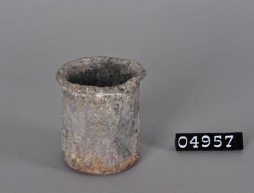 Zylinderförmige Flasche mit abfallender Schulter aus farblosem Glas. Leicht hochgestochener Boden. Hefteisenabriss ca 70 mm. Mündungsrand unregelmäßig. Um den Hals ein dicker Glasfaden, darauf ein fest und dicht verschmolzes ringförmiges Gefäß mit geschliffenem Mündungsrand. Der überstehende Hals führt dort durch, in das Gefäß darunter. Zweckbestimmung unbekannt.