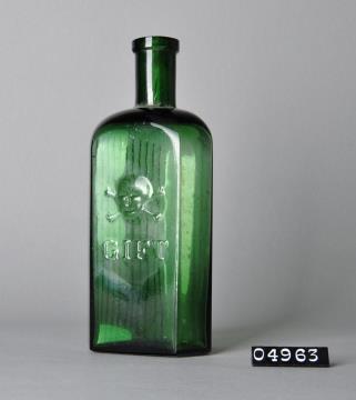 Grüne Dreikantflasche aus Glas mit in die Glasstruktur aufgeprägtem Totenkopfsymbol und gekreuzten Knochen. Verstärkter Mündungsrand. Unter dem Totenkopfsymbol die Prägung "Gift". Ein Seitenteil geriffelt, ein Seitenteil glatt für das Etikett. Nach oben gewölber Boden mit einem geprägtem Kreuz. Ohne Stopfen.