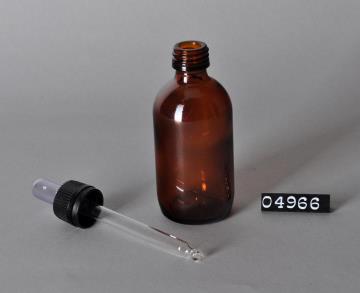 Brauner, zylindrischer Flaschenkörper mit abfallender Schulter der Firma ACEF. Mündungsrand verstärkt mit Schraubgewinde. Schwarzer Sicherheitsdrehverschluss aus Polypropylen (PP) mit Tropfenzähler aus farlosem Glas, Kunsstoffkappe aus Polyvinylchlorid (PVC). Bodenrand geriffelt und mit Prägung 50 und 30 ml.