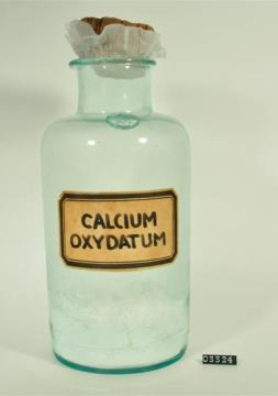 Zylindrischer, farbloser Flaschenkörper, Mündungsrand mit umgelegtem Faden und flacher Schulter. Auf der Schulter aufgeschmolzenes Glassiegel, gestempelt mit 2 ½ (= österreichisches Maß, d.h. vor 1870 hergestellt). Größter Durchmesser des leicht ovalen Glassiegels 31mm. Signiert von Toni Kerer. Mit Korkstopfen. Enthält Calciumoxid = Ätzkalk = gebrannter Kalk.
