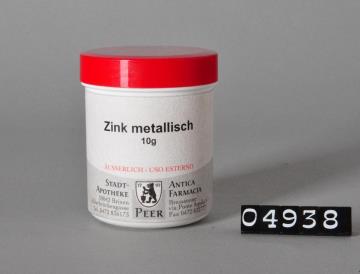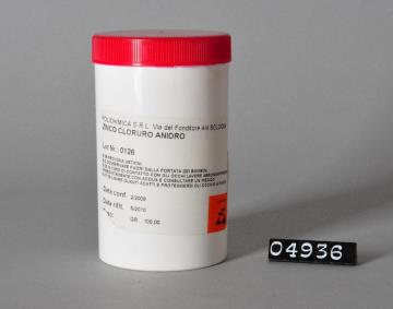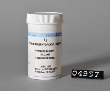 Weiße Dose mit rotem Schnappdeckel aus Polypropylen (PP). Innen Substanz im Nylonbeutel. Signiert. Mit Etikette der Firma Polichimica srl.. Abgefüllt am 02/2008. Mit Chargenschild der Stadtapotheke Peer vom 18/12/2008. Inhalt teilweise entnommen.