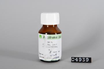 Braune Glasflasche mit weißem Schraubdeckel und rotem Sicherungsring. Signiert. Etikett der Fagron GmbH, Barsbüttel. Abgefüllt am 27.07.2008. Chargenschild der Stadtapotheke vom 29/01/2010. Zur Hälfte mit Dimethylsuloxid gefüllt.