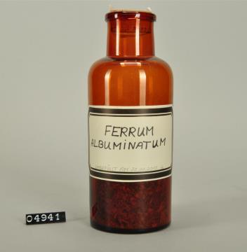 Braune Weithalsglasflasche mit flacher Schulter und Korkstopfen. Signiert. Weißes, achteckiges Schild mit schwarzem Doppelrand. Boden mit Prägung "500". Umgefüllt und getrennt aus Gefäß Nr. 01377 am 22.11.2013 von Elisabeth Peer, da Pulver und Flocken in einem Gefäß waren. Zu zwei Drittel mit Eisenalbuminat gefüllt.
