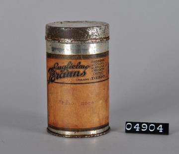 Runde, zylinderförmige Blechdose aus Weißblech mit Stülpdeckel. Rostflecke. Signiert. Etikett der Firma Guglielmo Brauns, Desio. Zu zwei Drittel gefüllt.