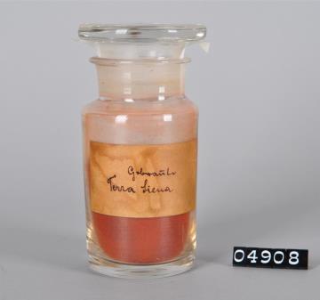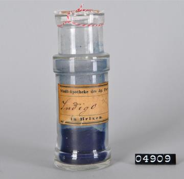 Braunes Weithalsglas mit Schliffstopfen. Gepresst, Boden leicht eingewölbt. Signiert mit Etikett der Drogerie des Mr. Fr. Peer Peer in Brixen: "Erythrosin wasserl. gelblich". "gelblich" mit anderer Handschrift zugefügt. Rückseite Preisschild mit Preisangabe in Heller. Ca. zu einem Viertel gefüllt.