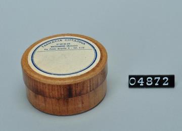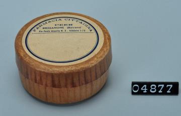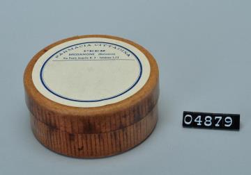 Fettdichter, brauner Salbentopf aus Pappe, Stülpdeckel mit Etikett. Innen gewachst. Blau bedrucktes, rundes Etikett der Farmacia Cittadina Peer.