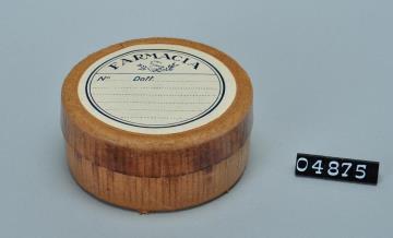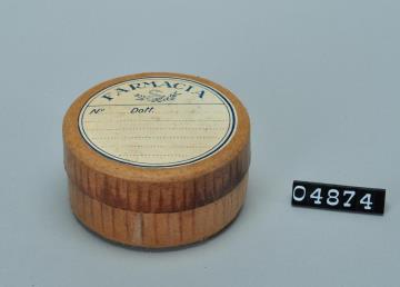 Fettdichter, brauner Salbentopf aus Pappe, Stülpdeckel mit Etikett. Innen gewachst. Blau bedrucktes rundes Etikett der Farmacia Cittadina Peer.