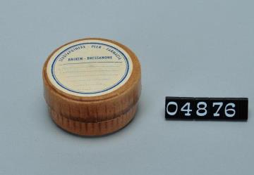 Fettdichter, brauner Salbentopf aus Pappe, Stülpdeckel mit Etikett. Innen gewachst. Etikett der Stadtapotheke Peer.
