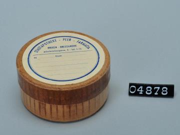 Fettdichter, brauner Salbentopf aus Pappe, Stülpdeckel mit Etikett. Innen gewachst. Etikett der Stadtapotheke Peer, Brixen.