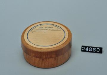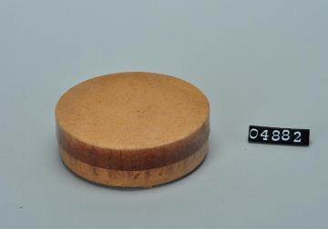 Braune, runde, flache Schachtel aus Karton. Stülpdeckel ohne Etikett. Innen nicht gewachst.
