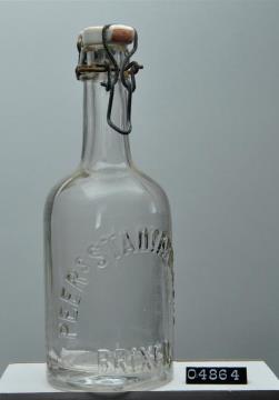 Farblose Enghalsflasche, langer Hals, aus Glas mit Klappverschluss und bogenförmiger Prägung "Peer's Stadtapotheke" auf der Flaschenwand und gerader Prägung "Brixen" am unteren Flaschenrand. Klappverschluss (Bügelverschluss) aus Porzellan mit Gummidichtung. Porzellanverschluss ohne Prägung. 1877 ließ sich der aus Magdeburg stammende Hermann Grauel den Klappdeckelverschluss patentieren. Unter der Bezeichnung Seltersverschluss blieb er bis 1969 der vorherrschende Verschluss für Mineralwasser.