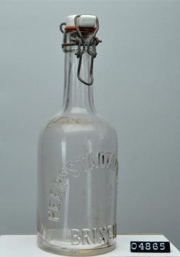 Farblose Enghalsflasche, langer Hals, aus Glas mit Klappverschluss ohne Prägung auf der Flaschenwand. Klappverschluss (Bügelverschluss) aus Porzellan mit Gummidichtung. Porzellanverschluss Oberseite mit Prägung: "Reformsodawasser Stadtapotheke Brixen" und Vorderseite der Nase: "A.G.F. Glasind. Neusattl Böhmen Patent"- 1877 ließ sich der aus Magdeburg stammende Hermann Grauel den Klappdeckelverschluss patentieren. Unter der Bezeichnung Seltersverschluss blieb er bis 1969 der vorherrschende Verschluss für Mineralwasser.