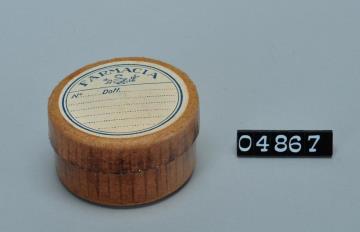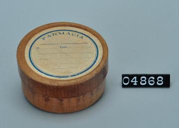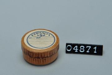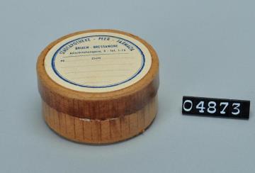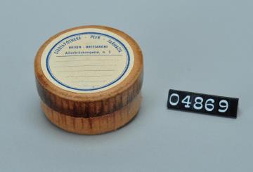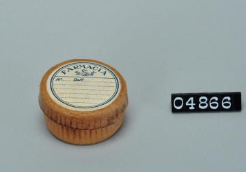 Fettdichter, brauner Salbentopf aus Pappe, Stülpdeckel mit Etikett. Innen gewachst. Blau bedrucktes Etikett der Stadtapotheke Peer Farmacia