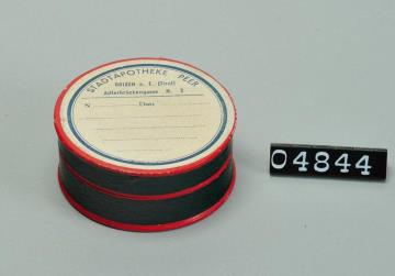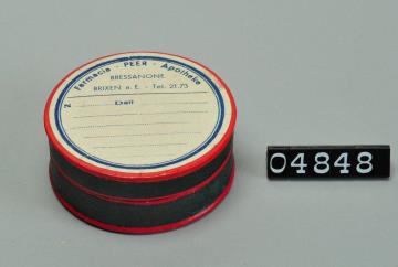 Runde Schachtel aus Karton mit Stülpdeckel. Seitlich schwarzer Glanzpapierbezug mit roten Rändern. Einfarbig blau bedrucktes rundes, liniertes, den Deckel ausfüllendes Firmenetikett der Stadtapotheke Peer Brixen a.E. (Tirol)